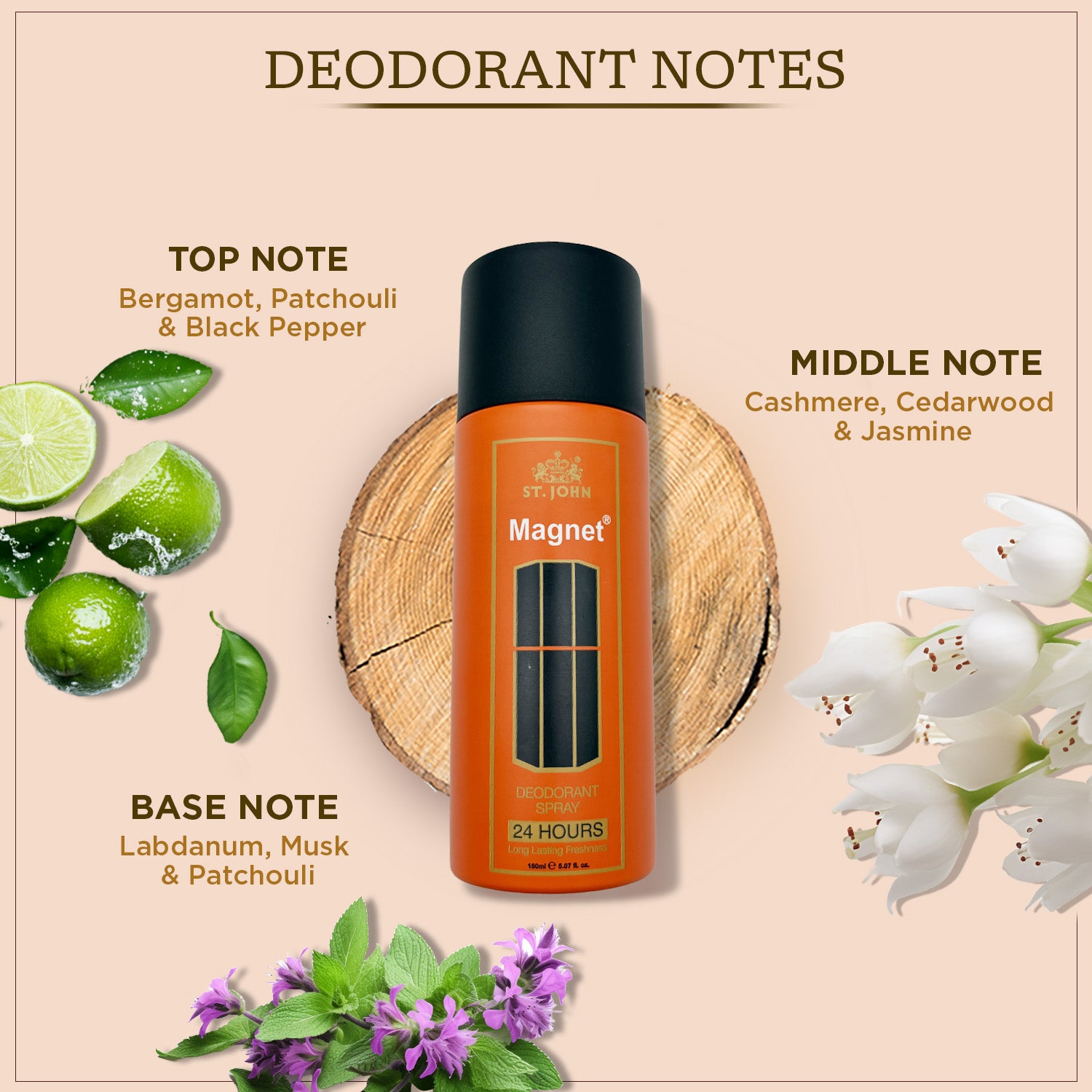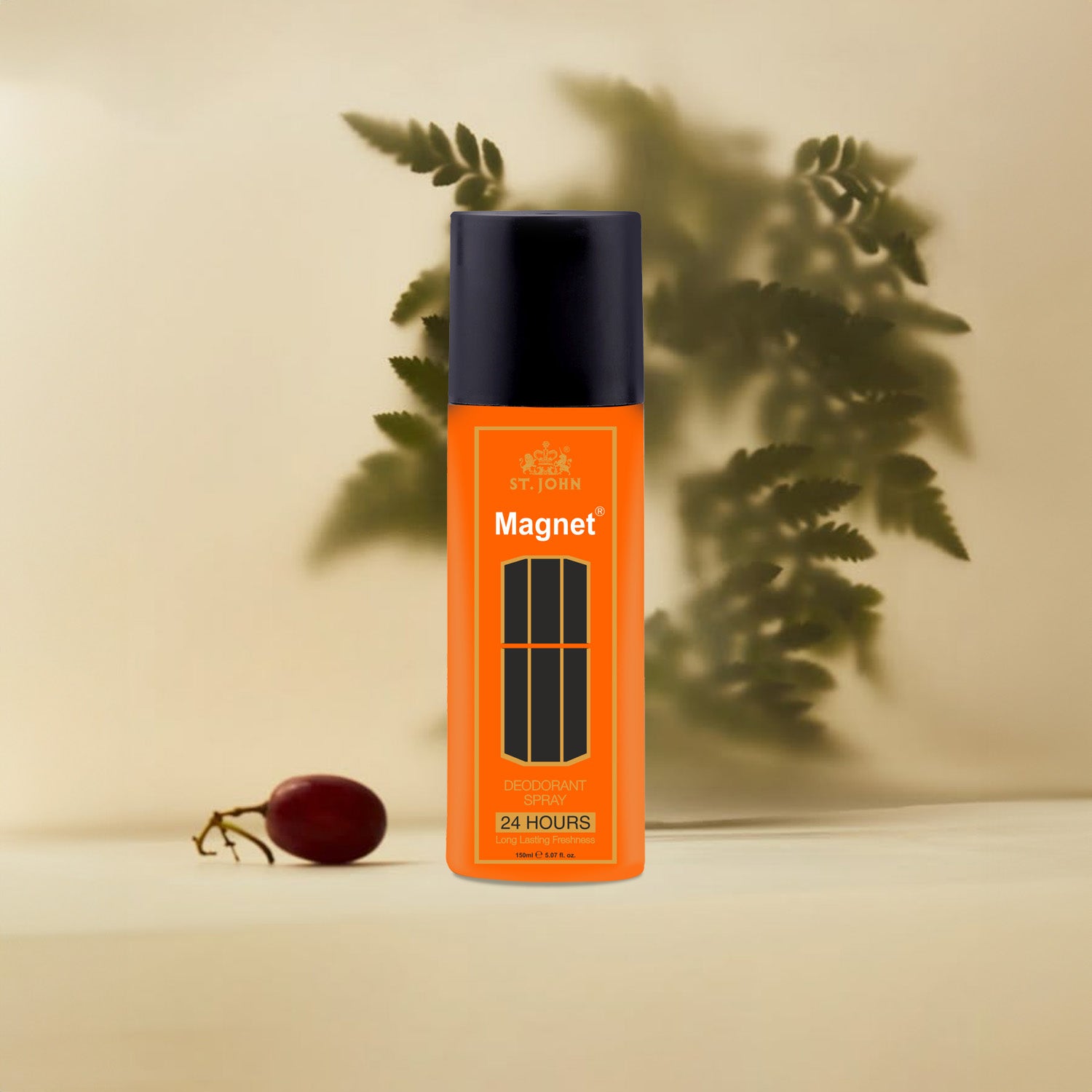 Bring out your inner magnetism with ST. JOHN Magnet Deodorant, a balanced fusion of woody and floral notes. This is the best woody and floral body spray for men who appreciate subtle elegance and natural charm. With its long-lasting formula, it keeps you fresh, confident, and ready to impress all day long.