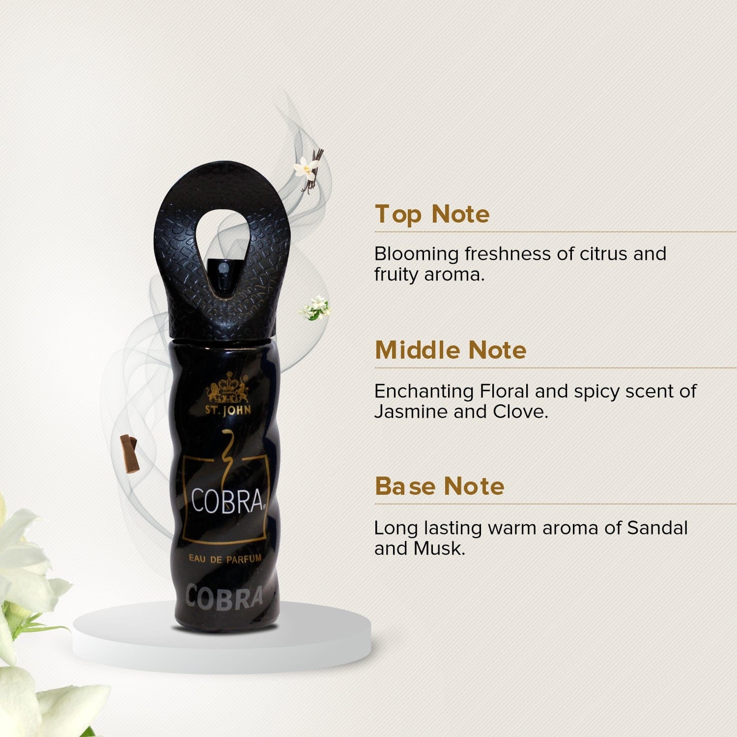 Dive into a sensory journey with ST.JOHN Cobra Classic Perfume. This is not just a body spray but a symphony of exotic aromas that captivate and intrigue, making it the best perfume for men under 300.
