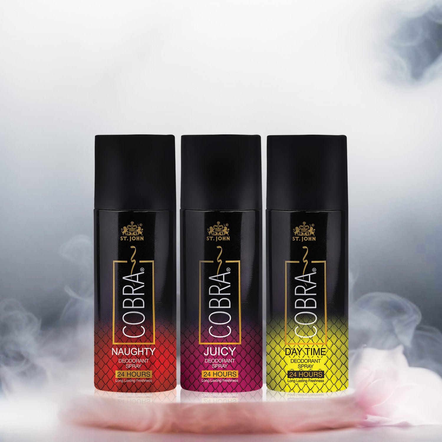 Elevate your freshness game with the Cobra Pack of 3 Deodorant Combo. This trio of long-lasting perfumed body sprays is designed to keep men and women feeling fresh and confident all day. Featuring the refreshing and juicy notes of the Juicy Deo, the invigorating fruity & citrus burst of the Naughty Deo, and the earthy allure of the Daytime Deo, this combo ensures you are ready to tackle any day with energy and vitality. Perfect for those who seek a blend of freshness, sensuality, and lasting fragrance in their daily routine.