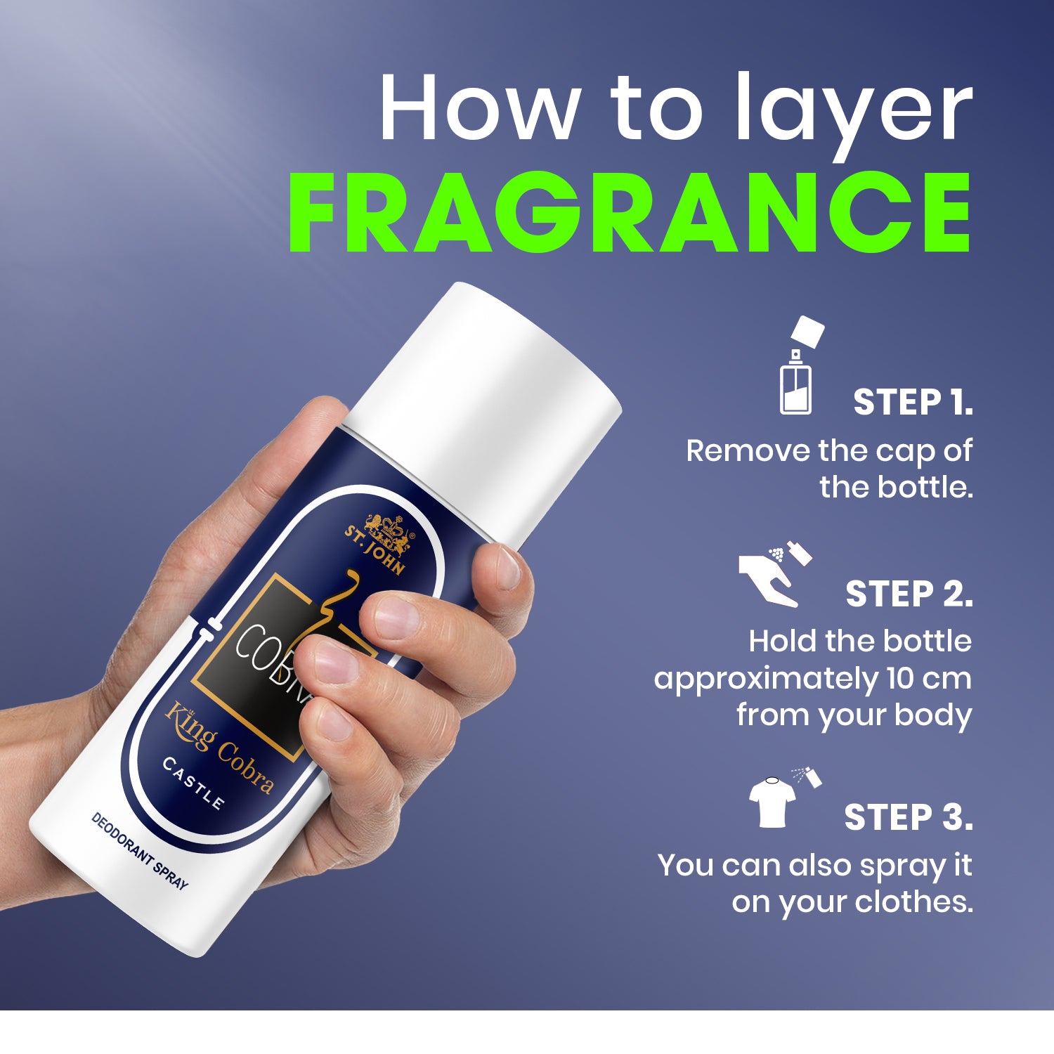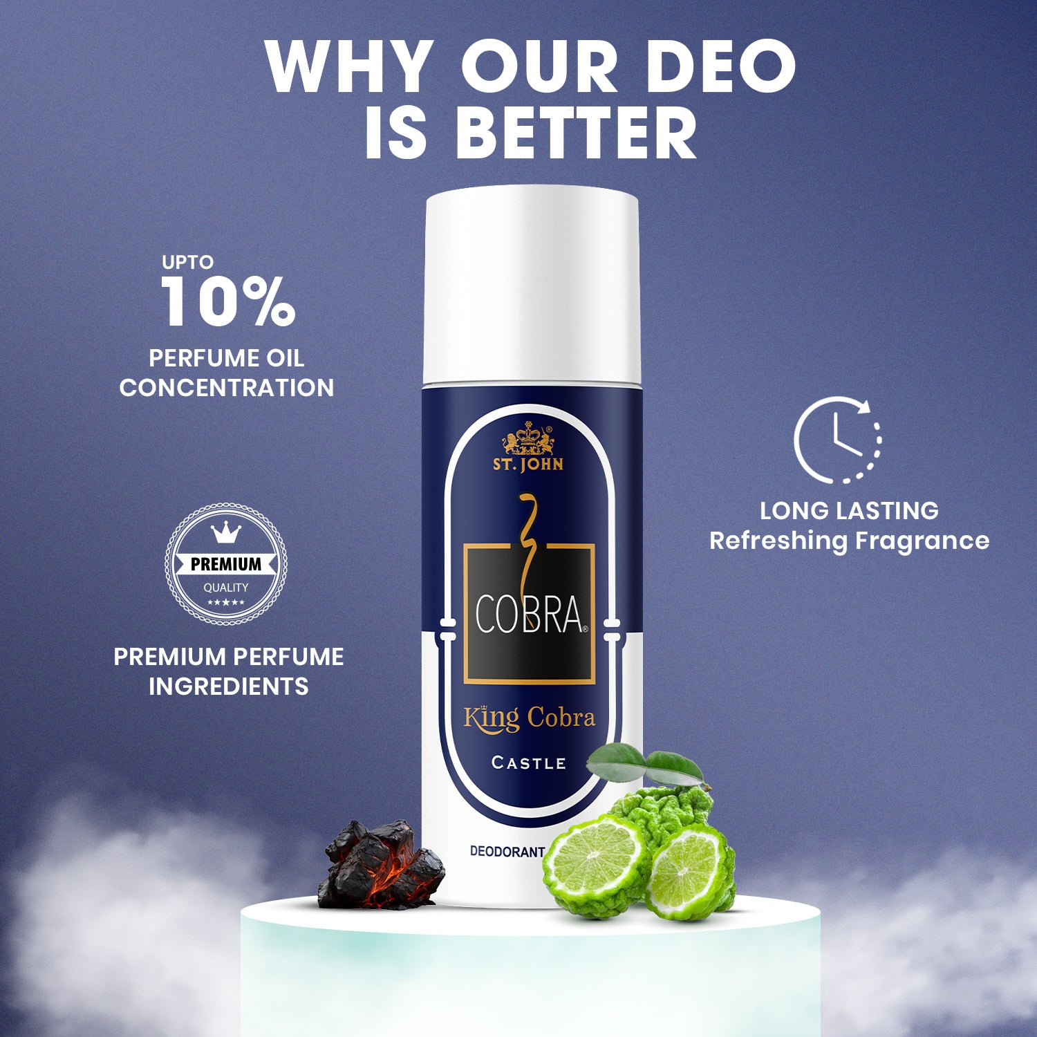 Step into confidence with King Cobra Castle Deodorant, a premium men’s deodorant designed for the modern man who values strength, style, and lasting freshness. This long-lasting deodorant spray provides effective all-day odour protection, keeping you fresh and confident from morning to night.