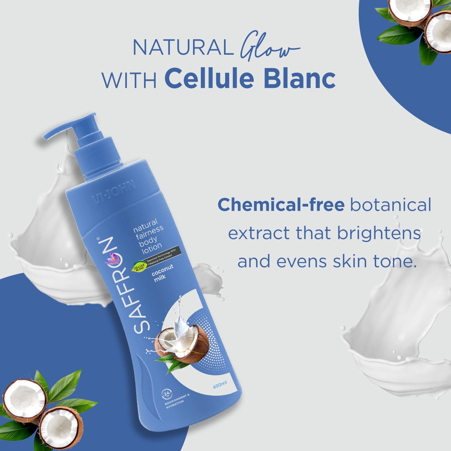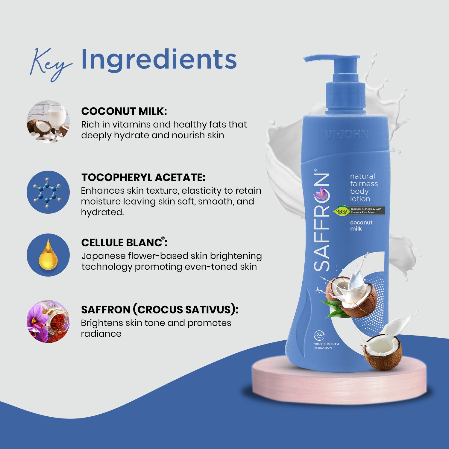 Nourish your skin naturally with the goodness of Saffron and Coconut Milk. VI-JOHN Saffron Natural Fairness Body Lotion is specially formulated to hydrate, soften, and enhance your skin’s natural radiance. Enriched with skin-brightening Saffron extracts and deeply moisturizing Coconut Milk, this body lotion penetrates deeply to keep your skin smooth, supple, and visibly fairer over time.