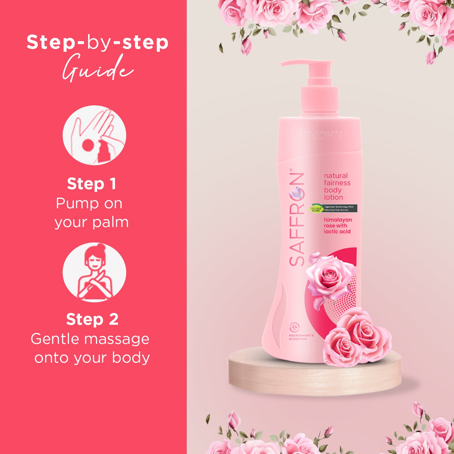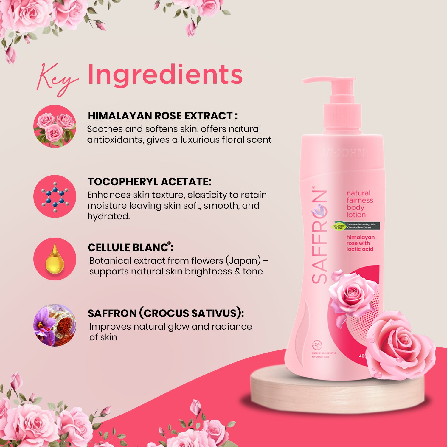 Indulge your skin in the floral goodness of VI-JOHN Saffron Natural Fairness Body Lotion – Himalayan Rose with Lactic Acid. Enriched with the natural essence of Himalayan Rose, skin-brightening saffron, and exfoliating lactic acid, this luxurious body lotion delivers deep hydration while gently promoting an even-toned glow. Ideal for daily use on all skin types, it helps restore moisture, improve skin texture, and leave your body delicately scented with a refreshing floral fragrance.